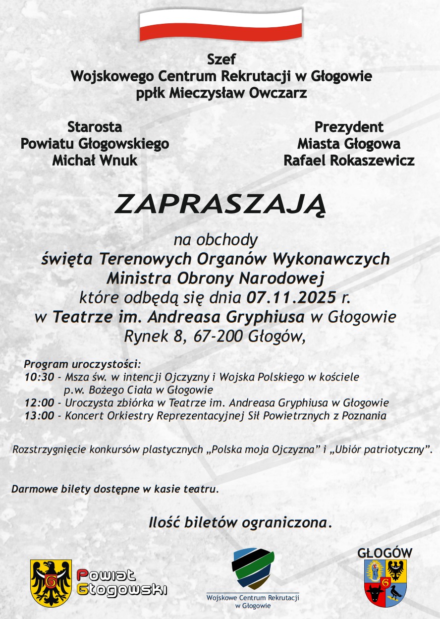 Szef Wojskowego Centrum Rekrutacji w Głogowie ppłk Mieczysław Owczarz, Starosta Głogowski Michał Wnuk oraz Prezydent Głogowa Rafael Rokaszewicz zapraszają na uroczyste obchody Święta Terenowych Organów Wykonawczych Ministra Obrony Narodowej, które odbędą się 7 listopada 2025 r.