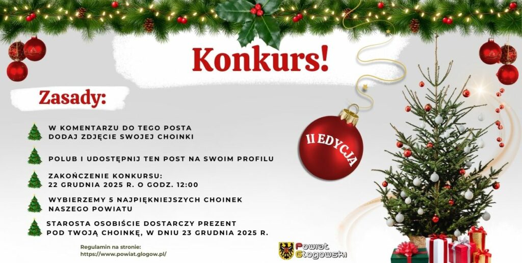 Powiat Głogowski organizuje wyjątkowy konkurs bożonarodzeniowy, w którym zadaniem uczestników jest opublikowanie w komentarzu pod postem konkursowym na profilu Starosty Głogowskiego Michała Wnuka zdjęcia własnoręcznie przystrojonej choinki.