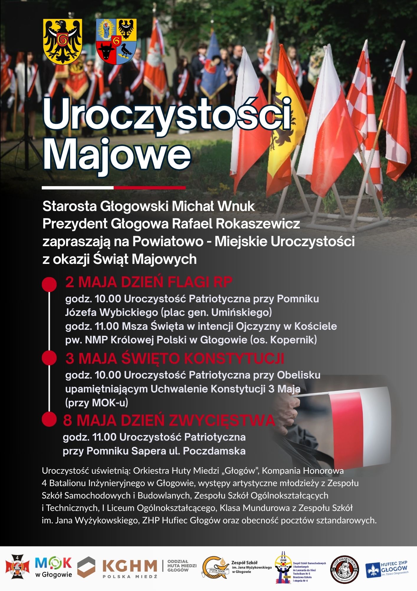 Starosta Głogowski Michał Wnuk oraz Prezydent Głogowa Rafael Rokaszewicz serdecznie zapraszają mieszkańców na Powiatowo-Miejskie Uroczystości z okazji Świąt Majowych.