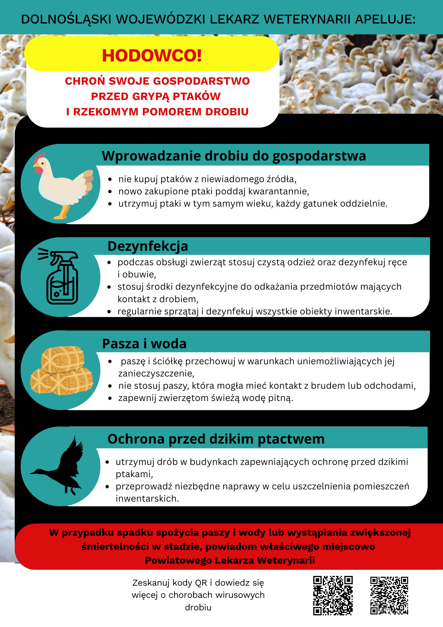 W związku z Rozporządzeniem nr 11 Wojewody Dolnośląskiego z dnia 18 marca 2026 r. w sprawie zwalczania rzekomego pomoru drobiu (ND) na terenie powiatów głogowskiego i polkowickiego oraz w związku z aktualną sytuacją epizootyczną, Dolnośląski Wojewódzki Lekarz Weterynarii zwraca się z apelem o zapoznanie się z materiałami informacyjnymi dotyczącymi wysoce zjadliwej grypy ptaków (HPAI) oraz rzekomego pomoru drobiu (ND).