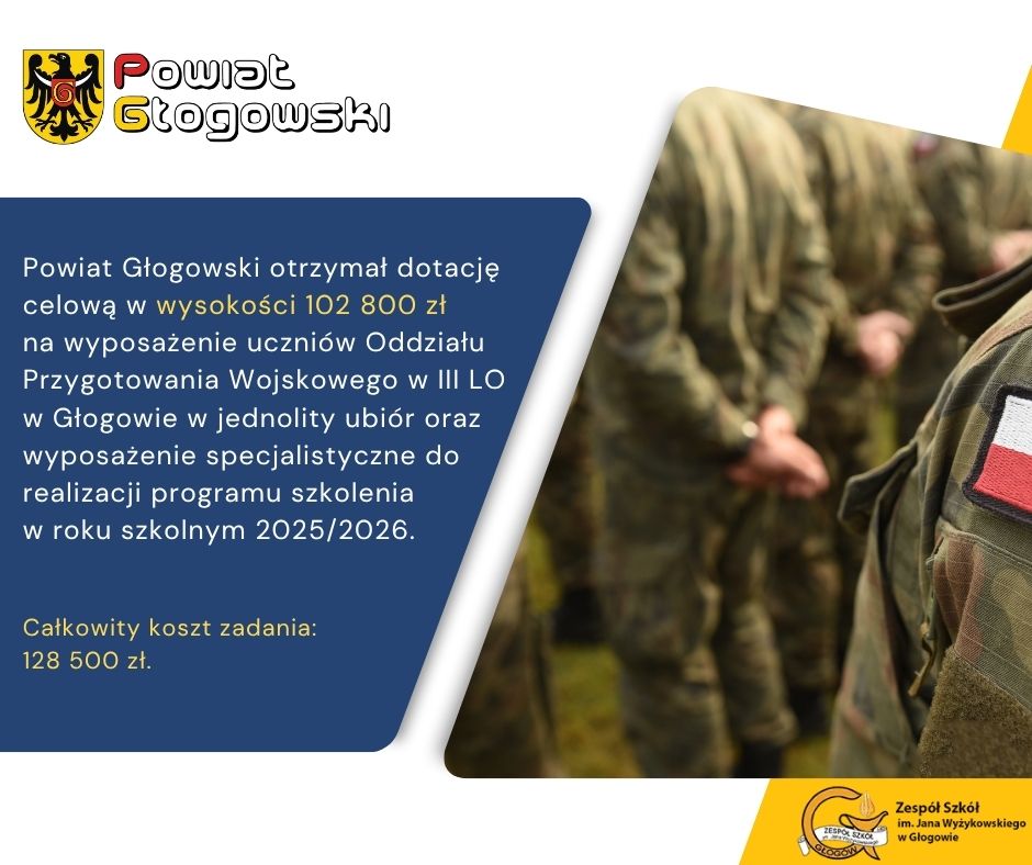 Powiat Głogowski otrzymał od Ministra Obrony Narodowej dotację celową w wysokości 102 800 zł na wyposażenie uczniów Oddziału Przygotowania Wojskowego w III Liceum Ogólnokształcącym w Głogowie (ZS im. Jana Wyżykowskiego). Środki zostaną przeznaczone na zakup zestawów jednolitego umundurowania oraz specjalistycznego wyposażenia niezbędnego do realizacji programu szkolenia w roku szkolnym 2025/2026.