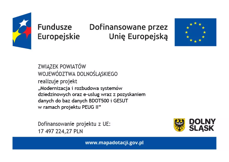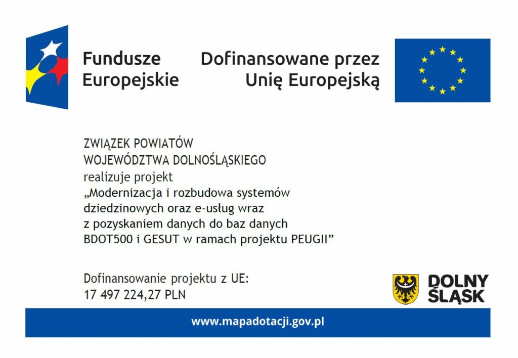 Projekt pn. „Modernizacja i rozbudowa systemów dziedzinowych oraz e-usług wraz z pozyskaniem danych do baz danych BDOT500 i GESUT w ramach projektu PEUG II” realizowany jest przez Związek Powiatów Województwa Dolnośląskiego w partnerstwie z 26 Partnerami Projektu tj.: