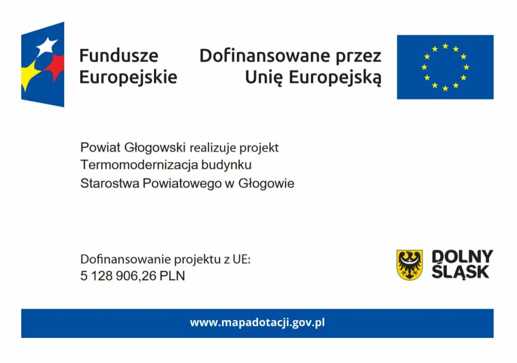 pt. „Termomodernizacja budynku Starostwa Powiatowego w Głogowie” wybranego do dofinansowania w ramach FEDS 2021-2027, w ramach Priorytetu nr 6 „Fundusze Europejskie bliżej mieszkańców Dolnego Śląska” Działania nr 6.1 „Rozwój lokalny – strategie ZIT” Programu Fundusze Europejskie dla Dolnego Śląska 2021–2027.