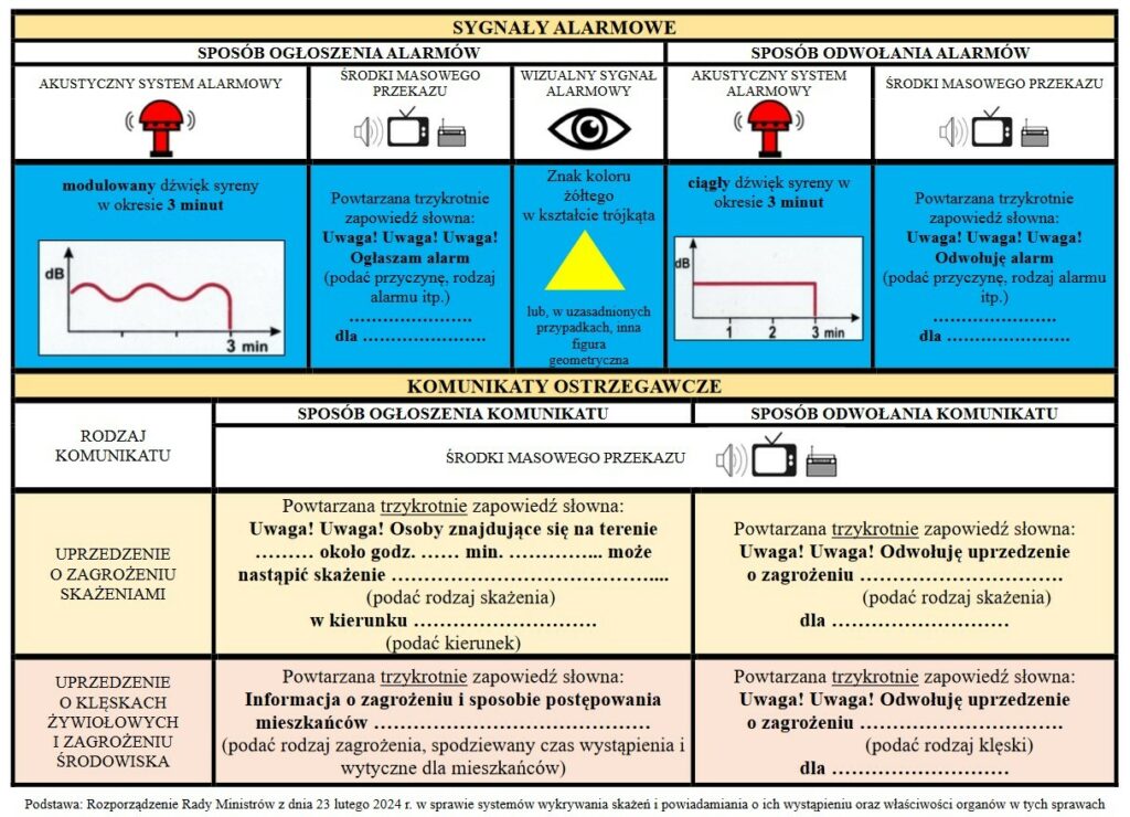 - w środkach masowego przekazu: powtarzana trzykrotnie zapowiedź słowna: Uwaga! Uwaga! Uwaga! Ogłaszam alarm (przyczyna, rodzaj alarmu itp.) …………… dla …………..,