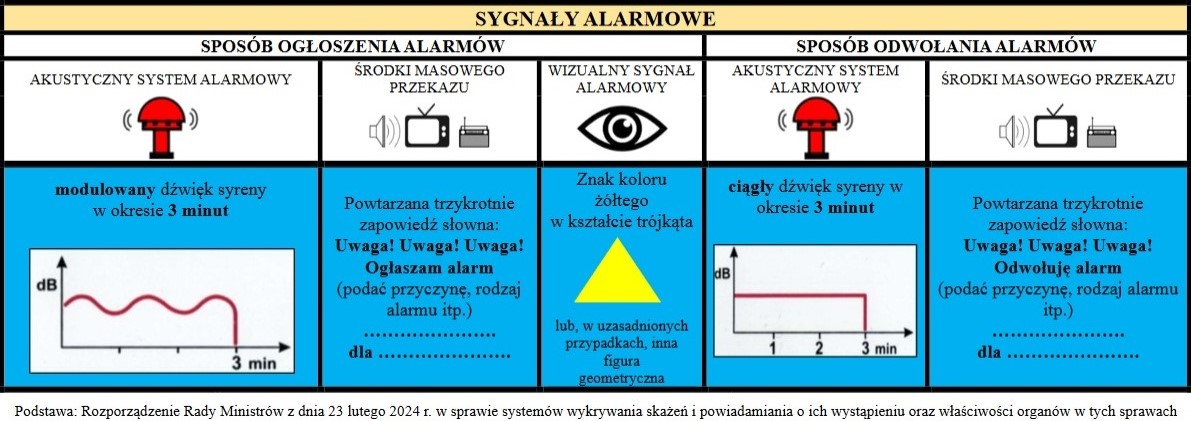 - sygnał akustyczny: ciągły dźwięk syreny w okresie trzech minut,