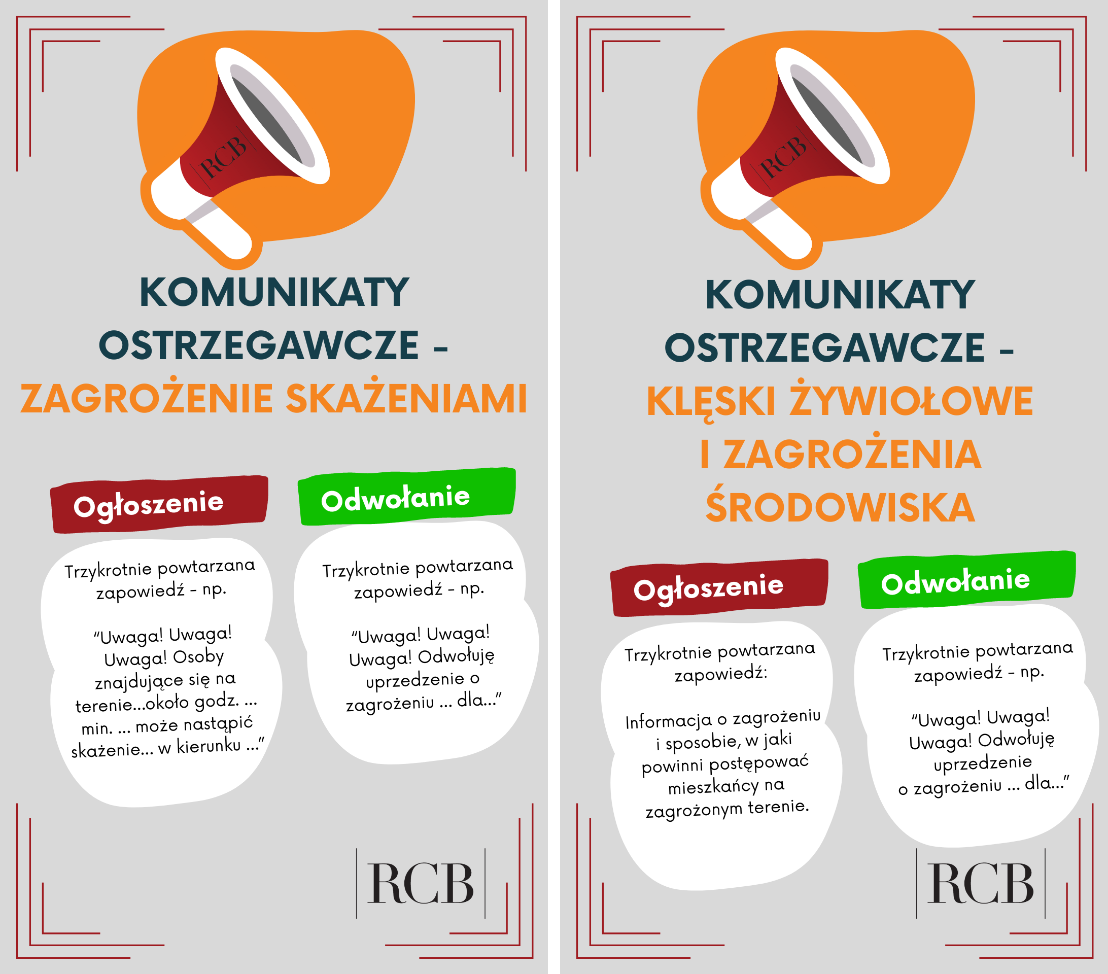 - sposób ogłoszenia komunikatu poprzez środki masowego przekazu: powtarzana trzykrotnie zapowiedź słowna: Uwaga! Uwaga! Osoby znajdujące się na terenie ……………… około godz. ….. min. ….. może nastąpić skażenie…………………………… (rodzaj skażenia) w kierunku ………………….,